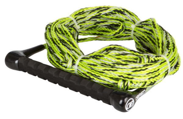 Трос. Ключевой элемент водных лыж. Один конец крепится к моторной лодке, другой держит спортсмен. Буксировочный фал должен быть маркирован и предназначен только для водных лыж. Длина выбирается в зависимости от уровня подготовки и веса катающегося. Важно учитывать минимальную растяжимость, жесткость, яркий цвет и прочность.