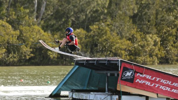 Этот элемент может показаться сложным для новичков, но опытные спортсмены выполняют его без проблем. Для упражнения используются трамплины в воде, высота которых настраивается в зависимости от уровня подготовки прыгуна. Начинают с небольшой скорости буксировки и низкого трамплина. Катер движется рядом со снарядом, а спортсмен выходит на параллельный курс. Заезд на высоту выполняется с немного согнутыми ногами и прямой спиной. На вершине прыжка спортсмен сгруппировывается, затем выпрямляется в воздухе и мягко приземляется на обе ноги с упруго согнутыми коленями. Упражнение усложняется увеличением скорости буксировки, высоты трамплина и добавлением препятствий на трассе.