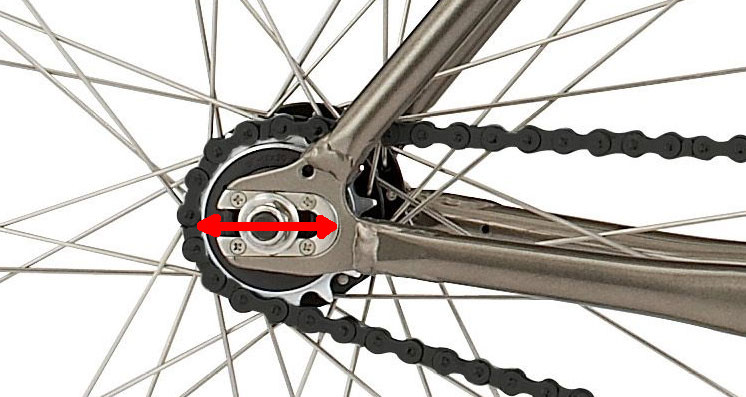 - Сдвиньте колесо по дропаутам для оптимального натяжения цепи.