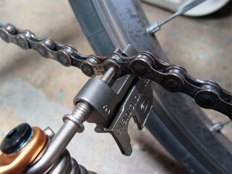 - Зафиксируйте цепь с помощью выжимки и медленно прокручивайте вороток, следя за неподвижностью инструмента в пине. Прокручивание сначала будет затруднительным, затем упростится, а в конце снова может усложниться. Снимите цепь, оставив пин с внешней стороны.