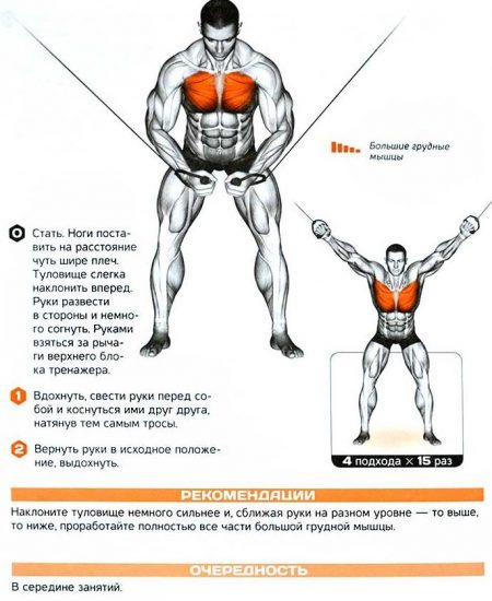 Классический вертикальный способ выполнения — не единственный, существуют и другие: наклонный, с нижних блоков, из положения лежа. Все они позволяют разнообразить нагрузку и подключить к работе другие мышцы, кроме грудной, если в этом есть потребность. Общие правила техники безопасности такие же: устойчивая опора, пружинистые руки, плавные движения и оптимальный подбор веса. Техника выполнения перечисленных упражнений: