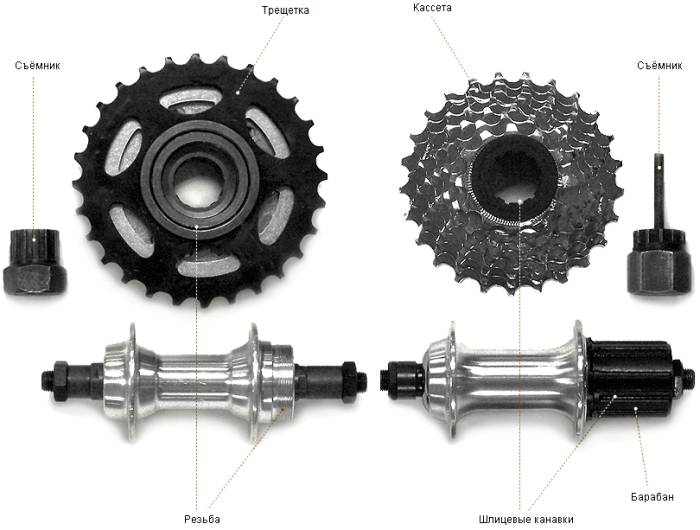 Устройство втулки заднего колеса скоростного велосипеда предусматривает наличие набора ведомых звезд, через которые колесу передается крутящий момент. Существует два типа набора задних звезд – кассета и трещотка.