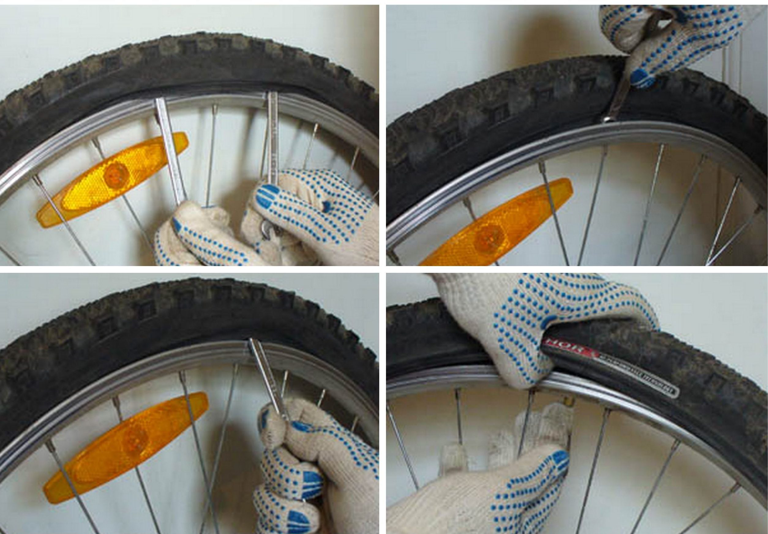 - Поддев шину, необходимо заправить ее ложечками в обод сначала в области ниппеля и далее по окружности.