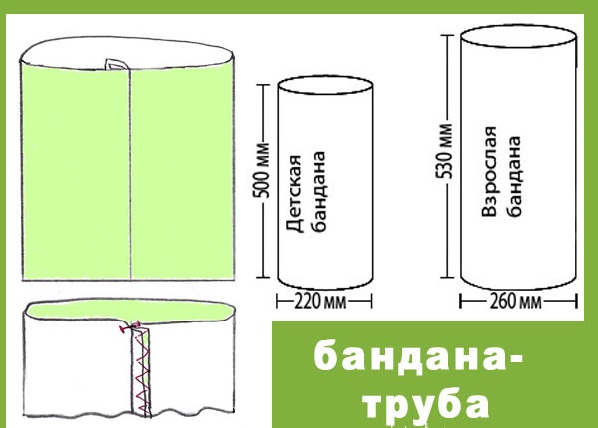 Эти размеры ориентировочные. При пошиве обязательно нужно снять мерки и сделать выкройку. Размер также зависит от типа изделия. Например, банданы-косынки шьются по окружности головы и обычно имеют квадратную форму: 50 см (для малышей), 60 см (стандартные) или 70 см (большие). Модели-трансформеры имеют фиксированные размеры: детские — 50 см в длину и 22 см в диаметре, взрослые — 53 см в длину и 26 см в диаметре.