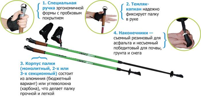 Высота палки для скандинавской ходьбы — не единственный критерий, который нужно учитывать при выборе. Обращают внимание и на конструктивные особенности: