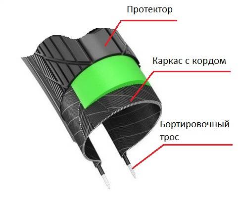 - Бортировочный трос. Находится в месте контакта шины с ободом, предотвращает растяжение шины под нагрузкой и изготавливается из стальных или кевларовых нитей.