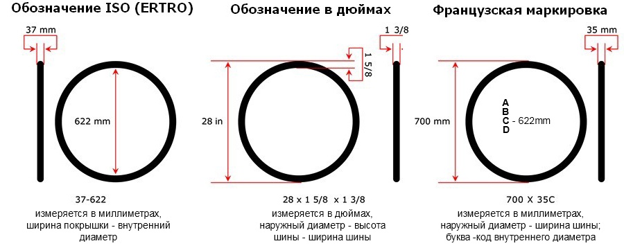 Французская. Маркировка выглядит, например, как 700 х 35С. Она обозначает внешний диаметр, ширину и внутренний диаметр, который указывается буквой – чем ближе буква к началу алфавита, тем меньше значение.