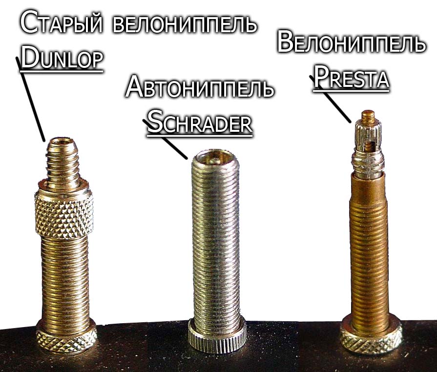 В настоящее время популярностью пользуются три типа велосипедных ниппелей: Dunlop, Schrader, Presta. Каждый из вариантов имеет свои особенности, плюсы и минусы: