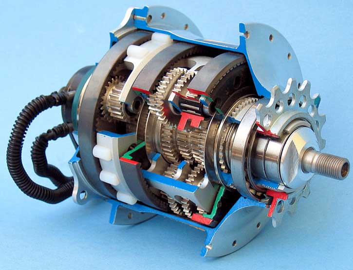 В трансмиссии находится механизм шестеренок в металлическом цилиндре. В центре — основная шестерня, вокруг которой вращаются остальные, как планеты вокруг солнца. Это основной принцип работы системы переключения скоростей.