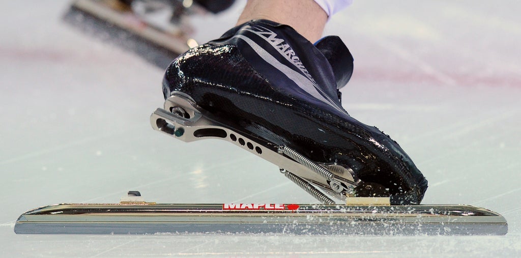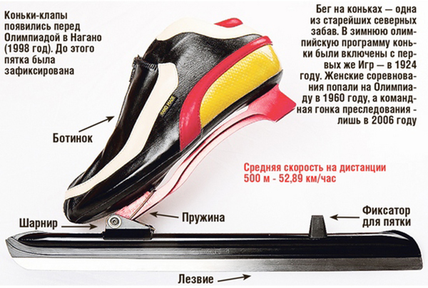 Важно отметить, что этот тип коньков предназначен только для скоростного бега, поэтому они не подходят для фигурного катания или хоккея. Главная особенность таких моделей — длинные лезвия с узкой кромкой, которые не жестко фиксируются к ботинку, а остаются подвижными. Шарнир и возвратная пружина обеспечивают отличное сцепление со льдом, хорошее скольжение и возможность развивать высокую скорость.