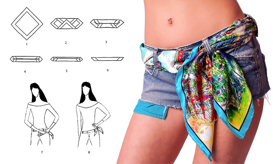 Повязку создают таким же образом, что и на шее. Единственное отличие — потребуется большой платок. Изделие складывают по диагонали, скатывают в не слишком широкую полосу. Банданой обворачивают бедра, затягивают свободным узлом, остатки прячут под основание.