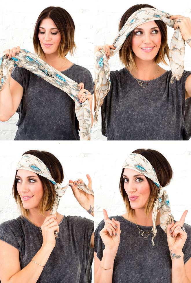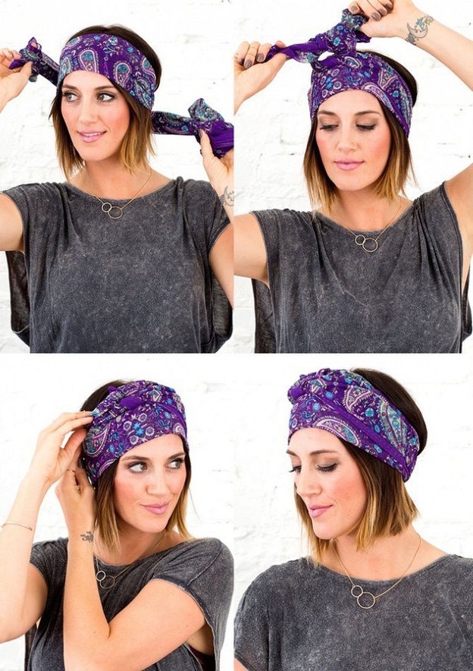 Хиппи — простой, доступный каждому метод. Если полоска, свернутая из платочка, получилась слишком длинной, кончики прячут под завязку.