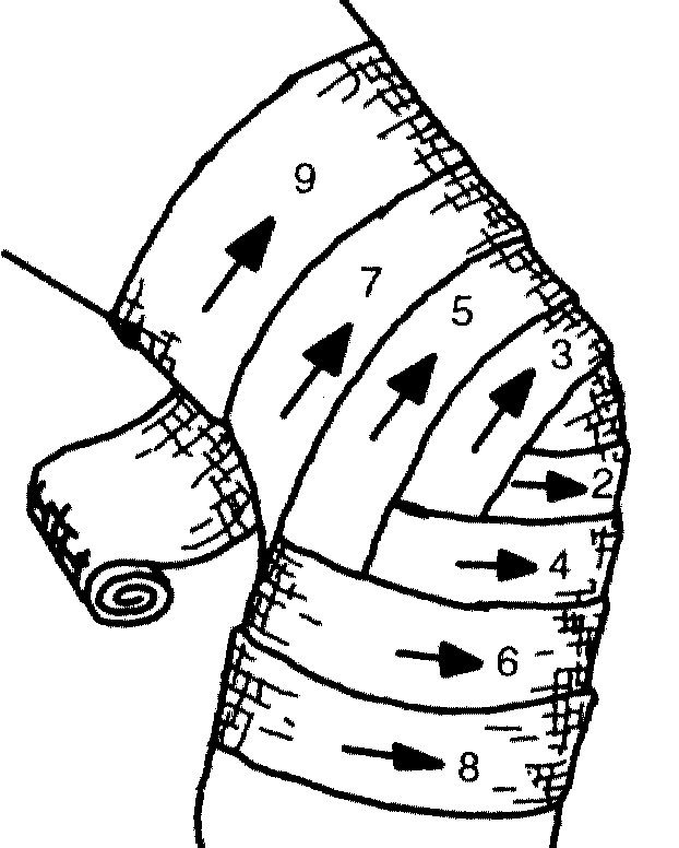 Наматывать эластичный бинт нужно, перекрывая каждым следующим витком предыдущий не менее чем на треть ширины и не более чем на половину. Следует ослаблять натяжение бинта по мере движения от узкой части к широкой. Повязка не должна иметь просветов и складок. Удобно пользоваться самофиксирующимися бинтами.