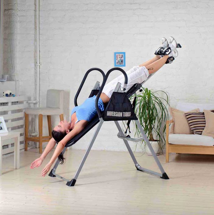 Инверсионный стол — это конструкция, напоминающая скамью, выполненная из металла или пластика и установленная на А-образной опоре. Он оснащен фиксаторами для ног и рукоятками для рук. Тренажер позволяет изменять положение тела под обычным и отрицательным углом, а также наклоняться вперед и назад, вплоть до полного переворота. В такой позиции можно выполнять наклоны, скручивания и другие простые упражнения. Это способствует расслаблению позвоночных дисков и удлинению позвоночника, что помогает избавиться от: