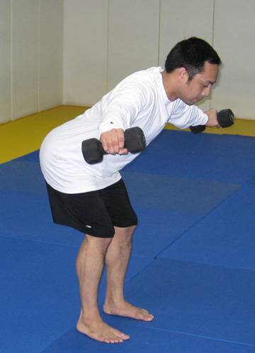 Есть одно превосходное упражнение, которое особо полезно для бойцов – удержание в наклоне. Возьмите легкие гантели и разведите прямые руки в стороны. Теперь, отводя таз назад, наклонитесь почти до параллели полу. Спина прямая, голова вдоль корпуса, колени согнуты, ладони смотрят вниз. Держите эту позицию на время.