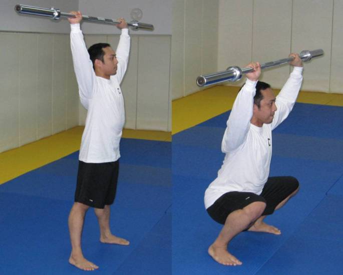 Мало что прорабатывает все тело сразу, как тяжелое приседание со штангой над головой. Однако – для развития специальной выносливости в плечевом поясе – эти приседания следует делать в большом диапазоне повторений с малым весом.