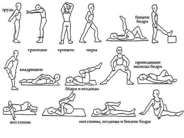 Фото 1. Пример заминки после тренировки. Упражнения направлены на растяжку различных мышц.