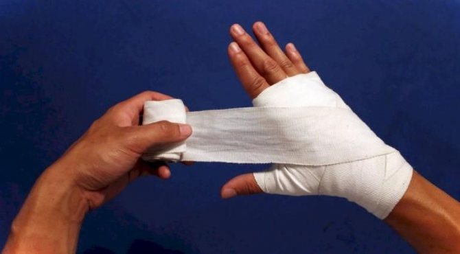 - Фиксация проблемной области. С помощью бинта обмотать проблемную область. Повязка должна быть крестообразной. 2 раза обмотать вокруг запястья, а потом через средний палец.