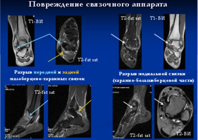 После осмотра голеностопа, рентгенографии, проведения МРТ травматолог устанавливает степень повреждения связочного аппарата. Терапия проводится по нескольким направлениям: устранение негативной симптоматики, предупреждение осложнений, восстановление целостности связочного аппарата. После заживления зоны разрыва восстанавливается функциональность голеностопа, нормализуется походка.