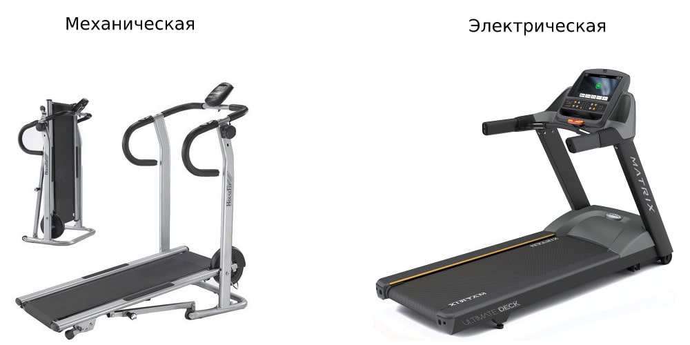 Существует всего два основных вида беговых дорожек — механические и электрические. Первые модели не требуют электропитания, спортсмен встает ногами на металлическую поверхность и, совершая поступательные движения, толкает полотно вперед. При этом создается эффект бега или ходьбы по прямой. Скорость может регулироваться в зависимости от силы воздействия на тренажер.