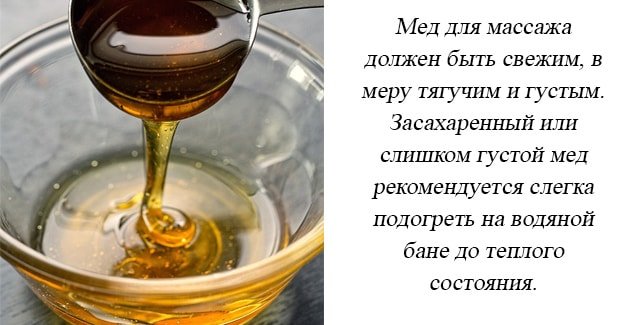 - мед, который используется для массажа, должен быть высокого качества. Это значит, что в его составе не должно присутствовать никаких добавок или примесей. Сам продукт, который обязательно должен быть полностью натуральным, можно взять любого сорта. Чтобы повысить эффективность терапии, рекомендуется использовать жидкий мед;