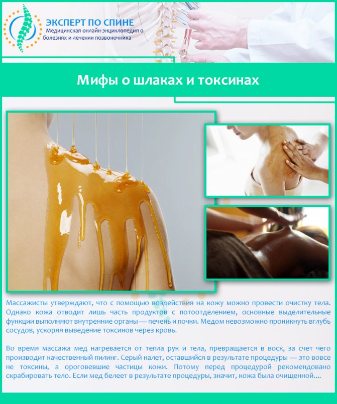 - Сам по себе мед — это отличный адсорбент, вытягивающий из скапливающейся в подкожном слое межтканевой жидкости шлаки, которые обычно выходят с потом.