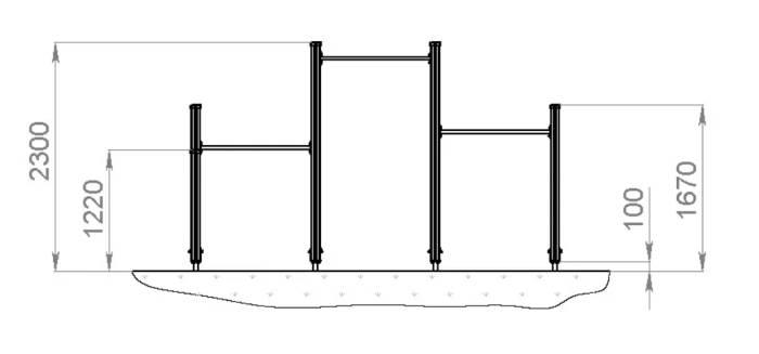 Опорные столбы турника устанавливаются на расстоянии 1200 мм друг от друга. Высота столбов — 2600 мм над поверхностью земли.