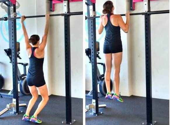 - Ухватитесь за перекладину (руки на ширине плеч), слегка согните колени и прыжком поднимите тело вверх.