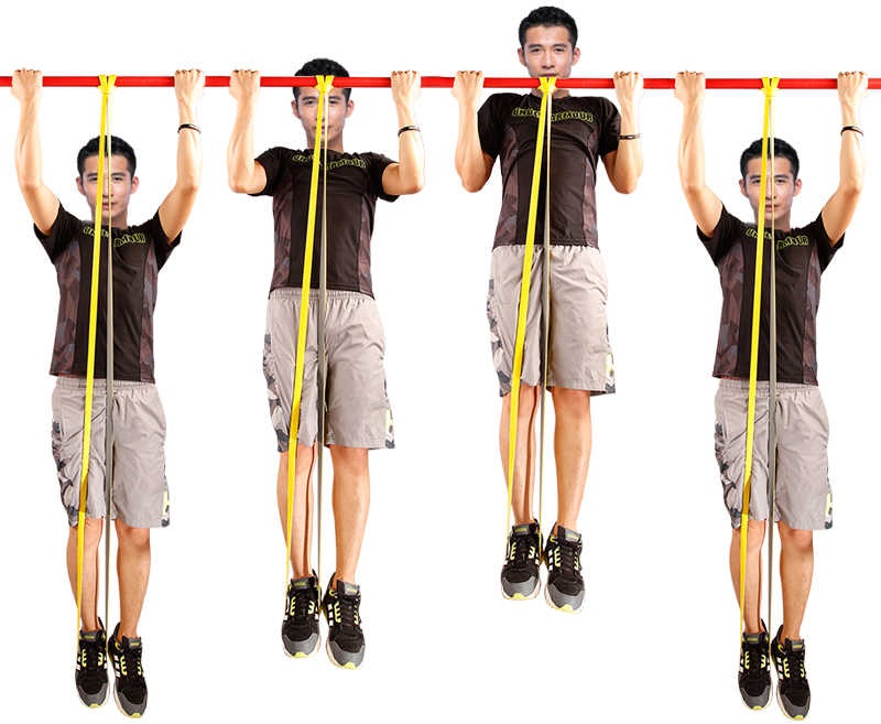Здесь работают по большей части руки и спина, но не менее действенно это упражнение на турнике для грудных мышц. Резиновую ленту в виде кольца легко прицепить к перекладине. Ее сокращение «компенсирует» часть массы тела, облегчая процесс подтягивания. Техника выполнения:
