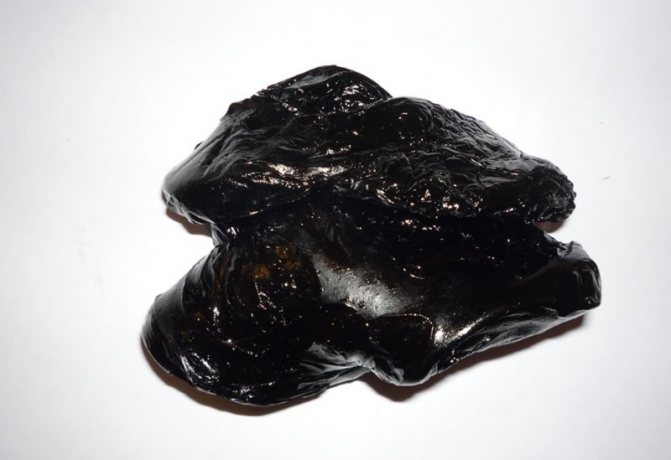 Рассматриваемое сырье представляет собой достаточно твердую массу, которая может иметь различные формы и величины. Она плотная и неоднородная, а также обладает зернистой или неровной, блестящей или матовой поверхностью. Также следует отметить, что рассматриваемое лекарственное сырье имеет тугопластичную или хрупкую структуру с включениями минерального, растительного и животного происхождения, которые заключены в смолоподобное вещество темно-коричневого, коричневого или черного цвета с бледно-серыми пятнами.