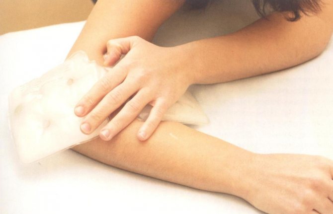 Для устранения отека и снятия боли на область повреждения накладывается холодный компресс.