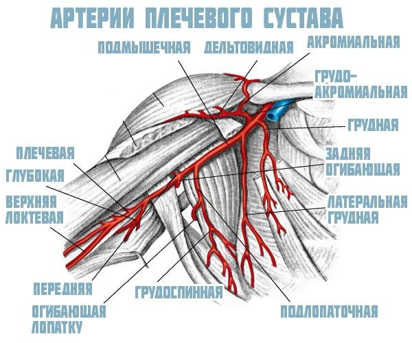Область articulatio humeri преимущественно кровоснабжается от подмышечной артерии. От нее отходят более мелкие артериальные сосуды, образующие два сосудистых круга – лопаточный и акромиально-дельтовидный. В случае закупорки основной магистрали, периартикулярные мышцы и сам плечевой сустав получают питание именно благодаря сосудам этих кругов. Иннервация плеча осуществляется за счет нервов, образующих плечевое сплетение.