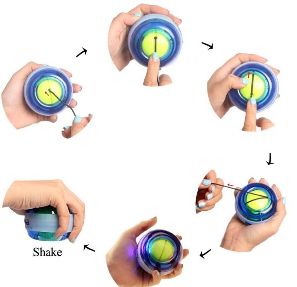 - Для тренировки запястья: удерживайте тренажер всей кистью, вращая его, сгибая руку в области запястья. Постепенно увеличивайте скорость, чередуя вращения по часовой стрелке и против.