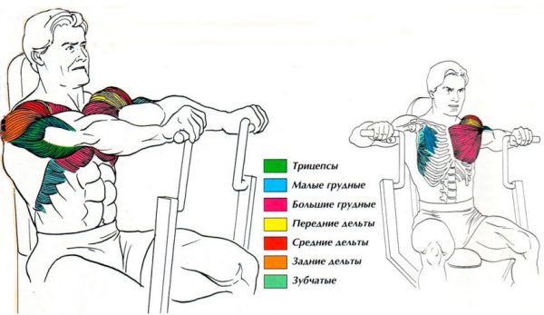 Жим рассчитан на проработку передних дельт, также нагрузка будет смещаться на средний пучок. Новичкам подобного движения будет достаточно. Опытным атлетам рекомендуется дополнить работу в Хаммере махами с гантелями стоя и протяжкой на задние дельты. Это позволит проработать плечи комплексно.