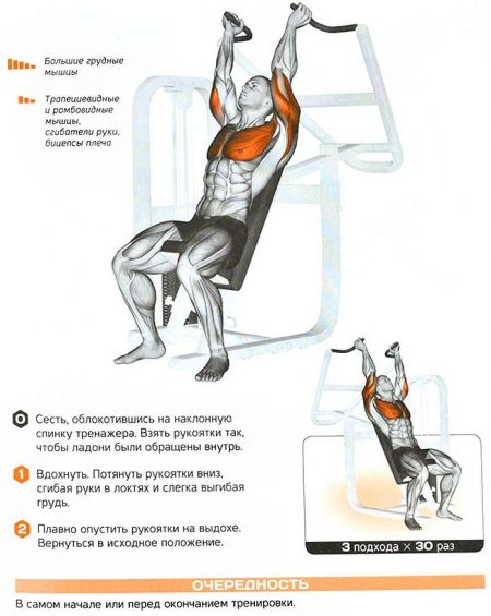 Техника выполнения такая же, что и до этого: поднимать снаряд требуется на выдохе, не допуская поясничного «мостика». Не стоит забывать, что жим из положения сидя нагружает не только верхнюю часть груди, но и передние дельты. Это может сказаться на силовых показателях в упражнениях на плечи, так что тренировать эти группы мышц лучше раздельно.