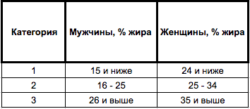 В таблице используются установленные Макдональдом диетические категории, в зависимости от процента жира в теле человека (достаточно знать примерно):
