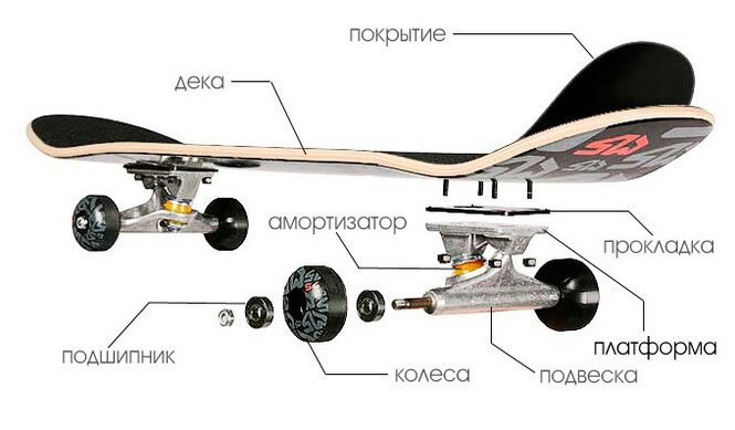 Дека. Основная часть устройства в форме доски с плавными изгибами и закругленными краями, изготовленная из спрессованного кленового шпона. Количество слоев зависит от стиля катания и трюков. Обычно доски имеют семь слоев, но есть и девятислойные модели. Для начинающих детей оптимально выбирать деку с 6-7 слоями.