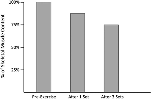Рис. 1. Истощение гликогена мышц после 1 и 3 подходов сгибаний предплечий (26).