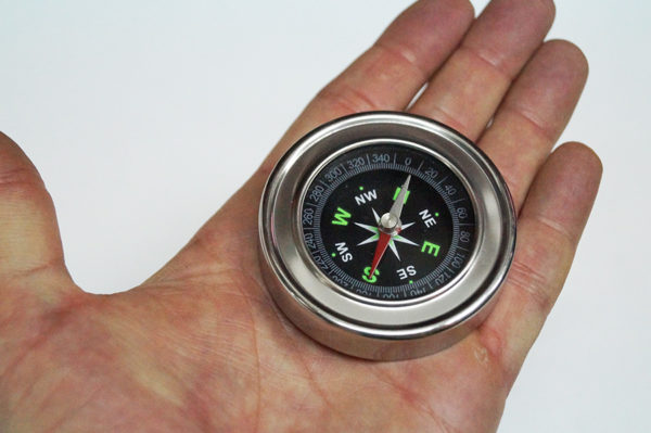 Магнитный. Наиболее распространенный вариант. В центре компаса вращается стрелка: верхняя часть указывает на север, нижняя — на юг. Достоинства — небольшие размеры и простота использования. Недостатки — невозможность применения вблизи электросетей и железнодорожных путей.