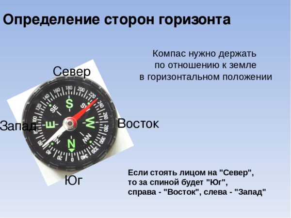 Для определения любой стороны горизонта достаточно точно знать только одну. Если вы стоите лицом на север, то со стороны спины будет юг, справа восток, слева запад. Самый простой и надежный способ определения сторон горизонта связан с использованием исправного компаса, чаще всего конструкции Андрианова.