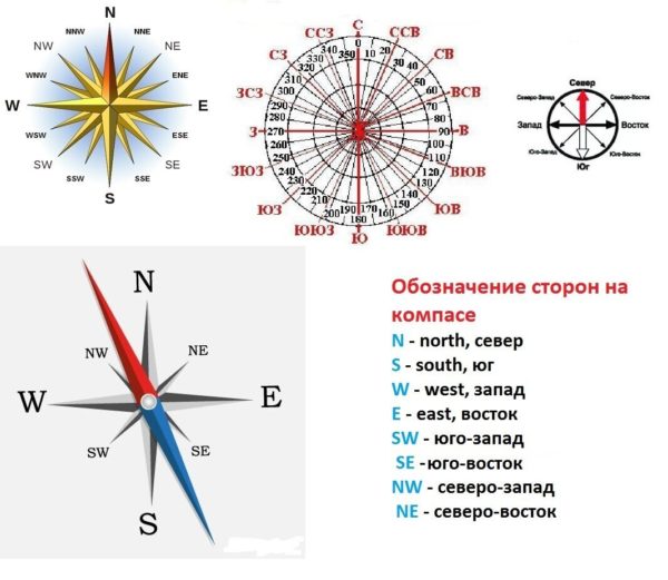 С (север) — Ю (юг), З (запад) — В (восток), СЗ (северо-запад) — ЮВ (юго-восток), СВ (северо-восток) — ЮЗ (юго-запад).