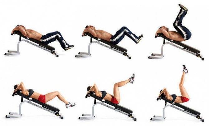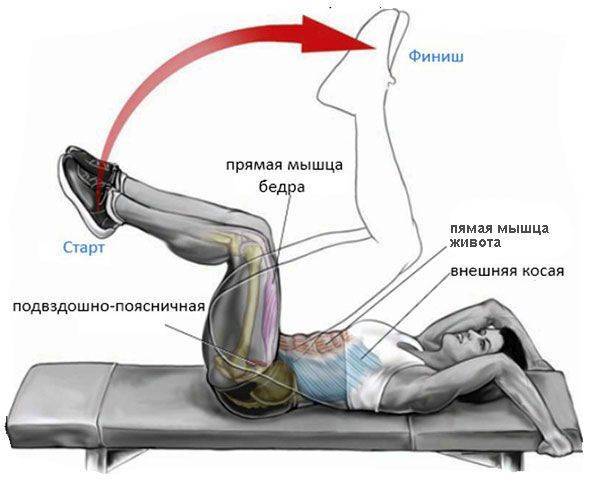 Выгибают поясничный отдел спины. Допускать этого нельзя, иначе можно просто потянуть спину. Она должна быть плотно прижатой к полу или наклонной скамье.