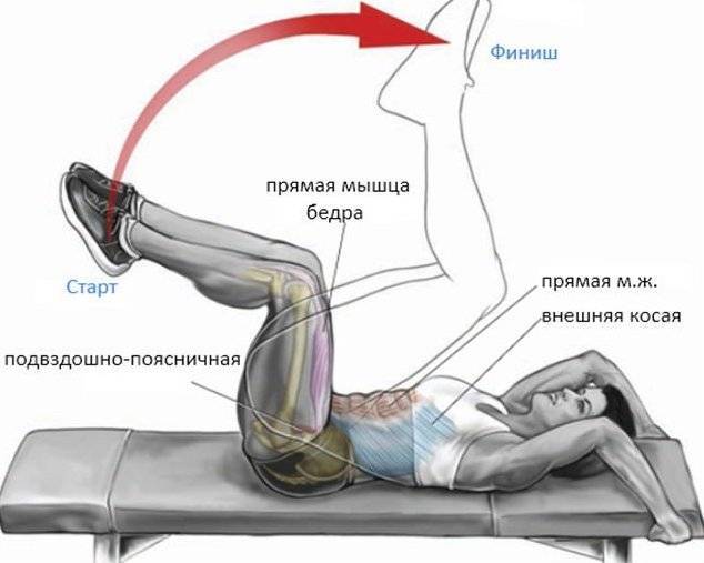 Заключается данное упражнение в том, что, лежа спиной на скамье (лавке или скамейке, если выполнять дома) и держась руками за снаряд, осуществляют сближение ног с корпусом путем их подъема по дугообразной траектории с постепенным неполным сгибанием в коленях и отрывом поясницы от рабочей поверхности. При этом прорабатывается очень большой мышечный ансамбль: