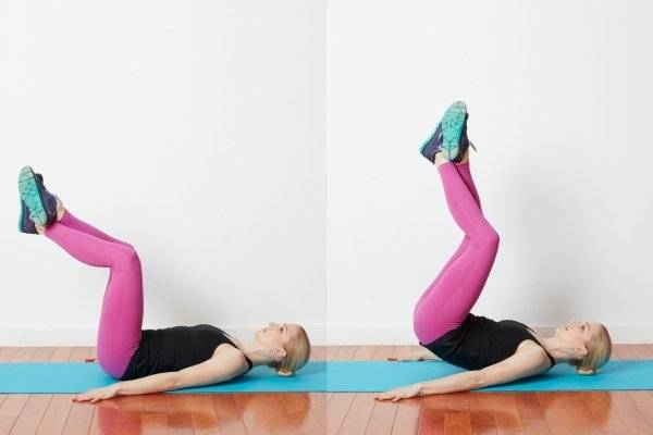 - Продолжая напрягать мышцы, медленно опустите ноги в исходное положение, не касаясь пола.