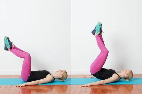 5. Продолжая напрягать мышцы, опустите ноги в исходное положение, не касаясь пола.