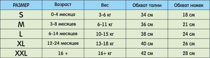 | Производитель | Вес ребенка, кг и размер |