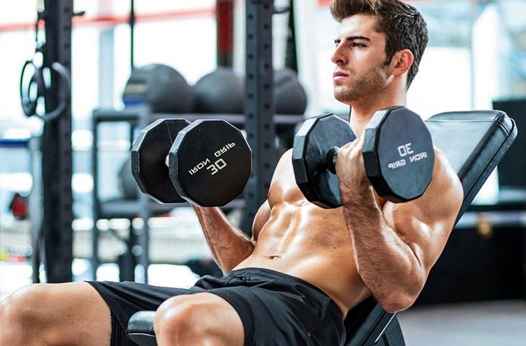 | Сгибание рук на наклонной скамье | Примите положение полулежа. Поочередно поднимайте руки с гантелями, сгибая их в локтях. |