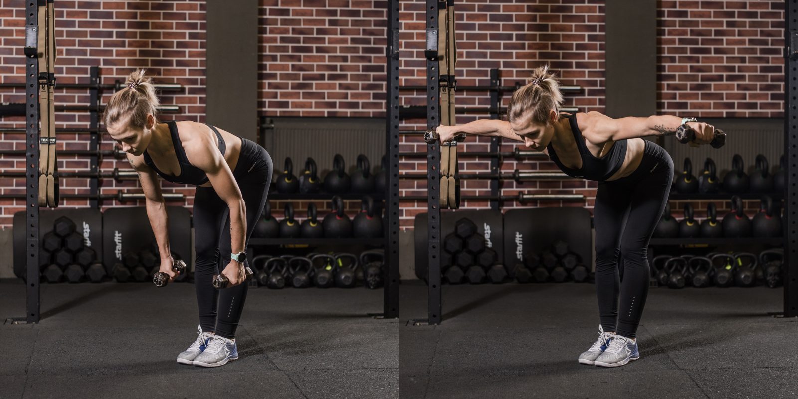 - Отведение гантелей назад — наклонитесь вперед, руки вдоль тела. Подводите их к груди, сгибая в локтях, и отводите назад.
