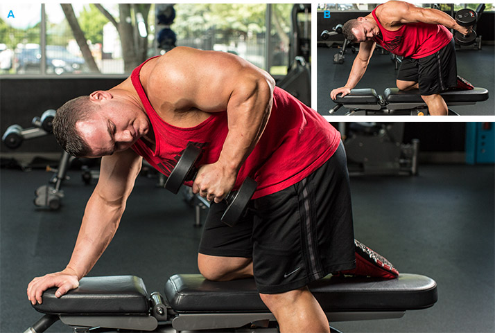 Наклонить корпус вперед, упереть руку в колено или скамью. Отводить гантели назад. Вернуться в исходное положение. Поменять сторону |