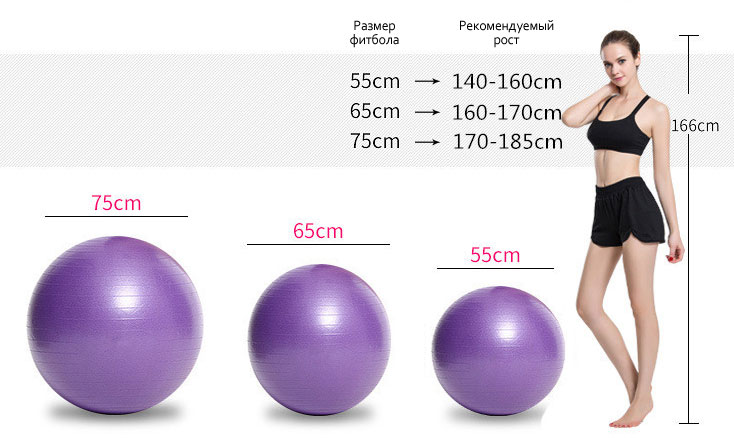 Выбирается с учетом длины рук: до 55 см — диаметр изделия 45 см, на 56-65 см – 55 см, на 66-80 см — 65 см, от 80 — 75 см. Учитывают также рост. Существует упрощенная формула: диаметр изделия = рост человек — 100. Самые популярные размеры мячика — 65 и 75 см для людей средней комплекции |